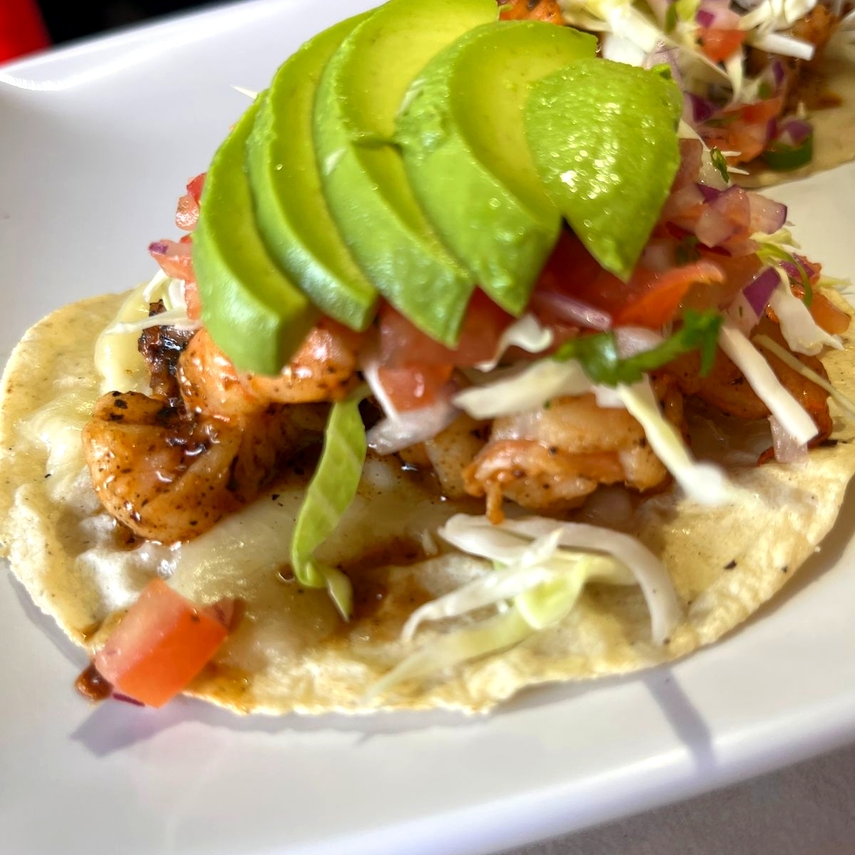 Taco de camarón a la plancha acompañado con repollo, salsa bandera y aderezo. Incluye limón y chile aparte