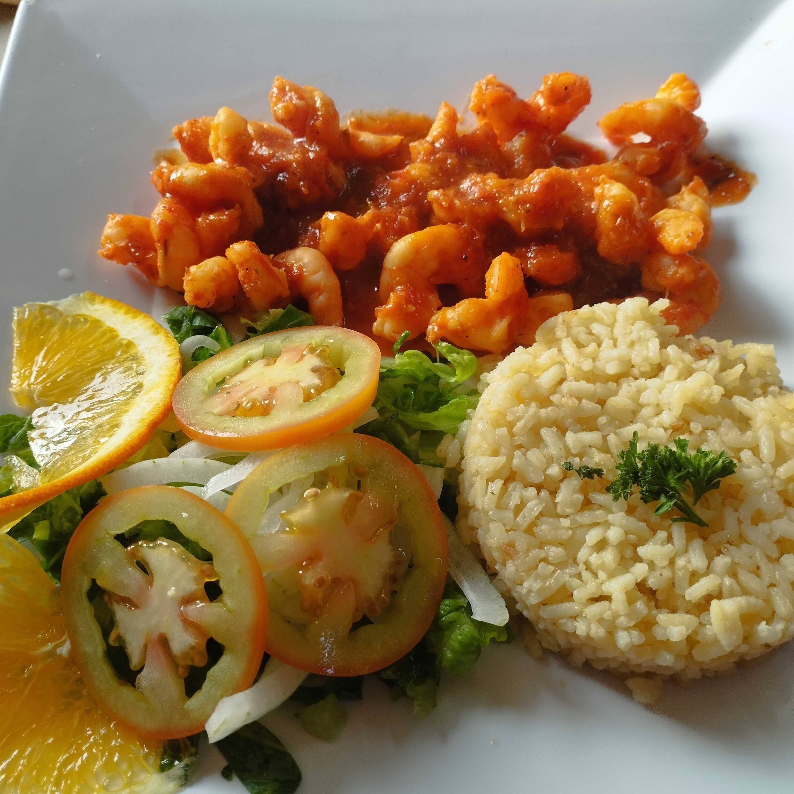 Camarón cocido con cebolla y pepino, acompañado con un preparado de la casa