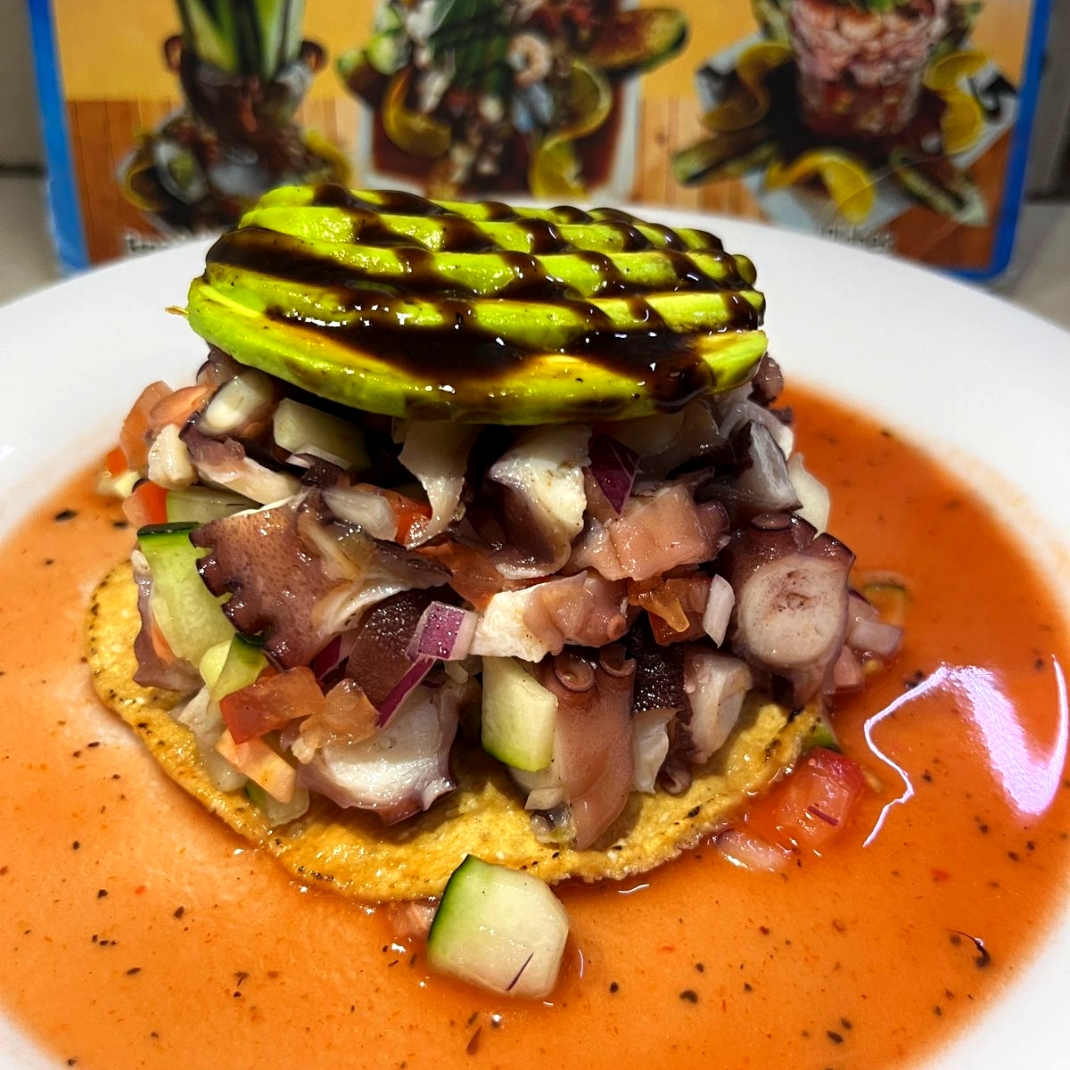 Botana de calamar, pulpo, camarón cocido, camarón crudo, medallón de atún y 2 ostiones. Incluye tostadas, galletas, catsup, mayonesa y chile.
