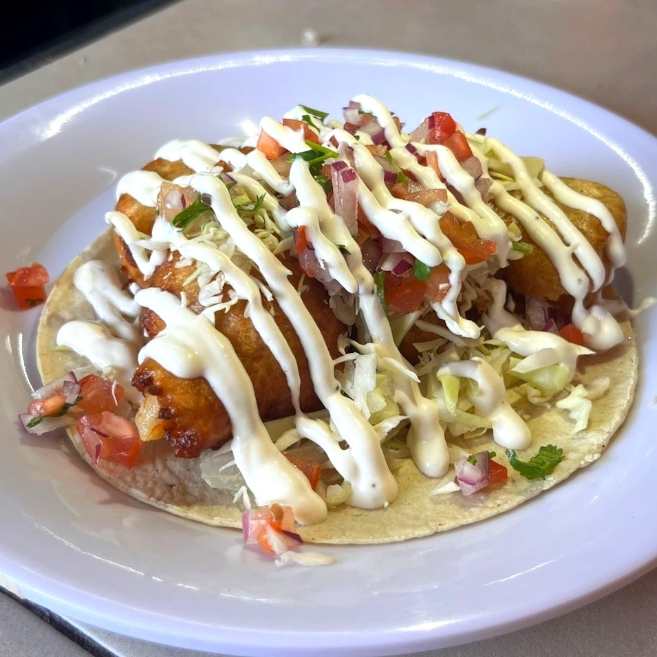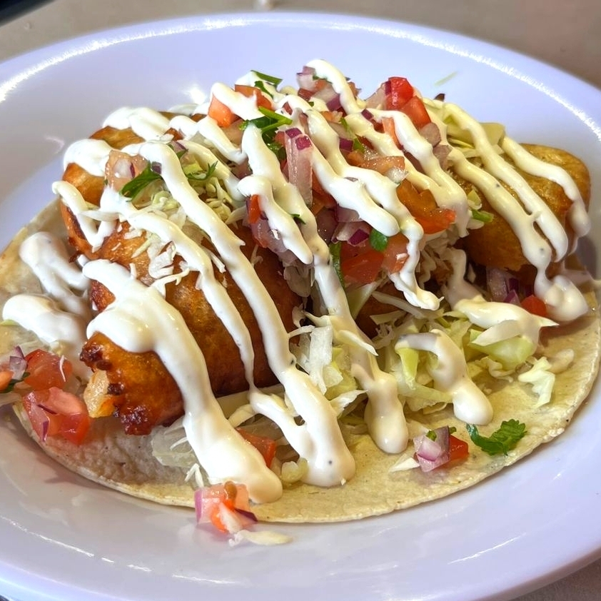 1 pieza Taco de pescado capeado acompañado con repollo, salsa bandera y aderezo. Incluye limón y chile aparte
