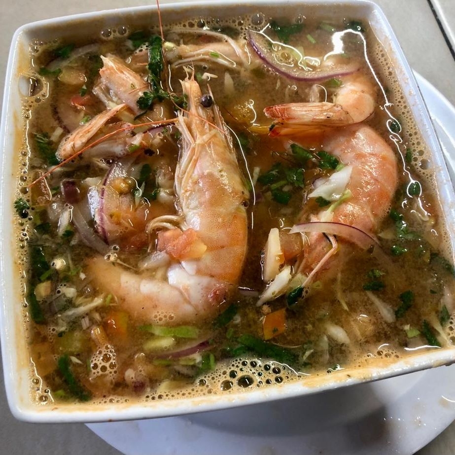 Ceviche de camarón curtido con Limón, cebolla, tomate y pepino finamente picado. Acompañado con tostadas, galletas, catsup, mayonesa y chile