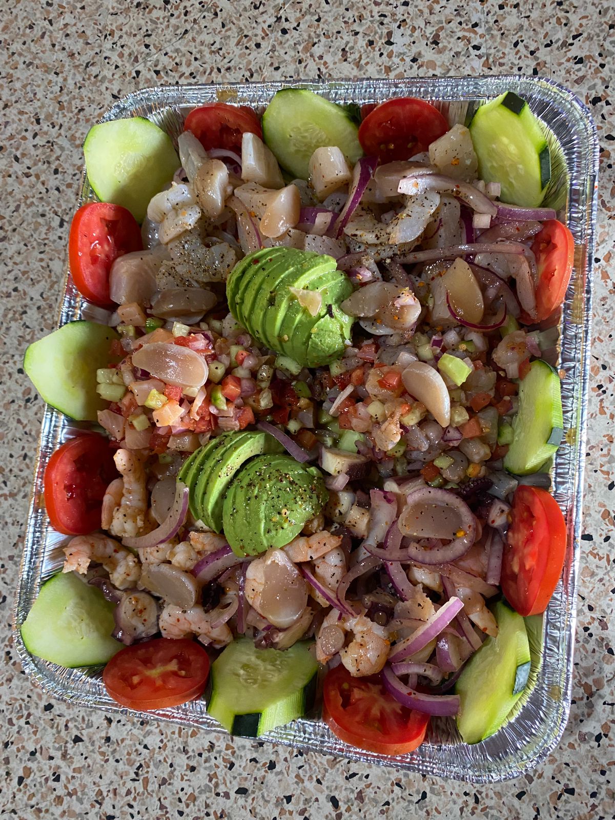 Camarón curtido, camarón cocido, calamar, pulpo y atún con cebolla y pepino en juliana con salsa de la casa.