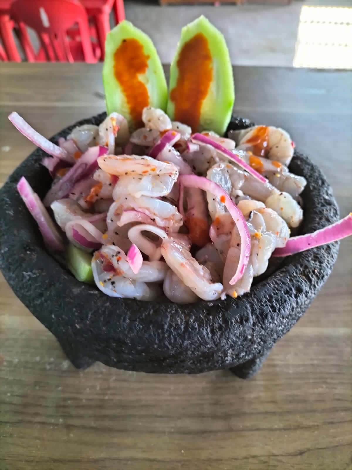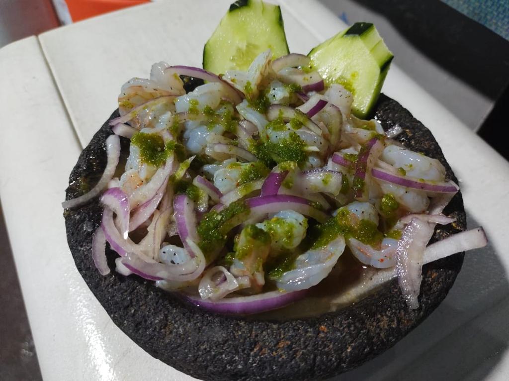 Camarón curtido con cebolla y pepino en juliana, en salsa de chiltepín natural molido.
