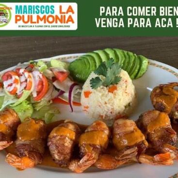 Camarones rellenos de marlín y queso, envueltos en tocino, acompañados de arroz y ensalada.