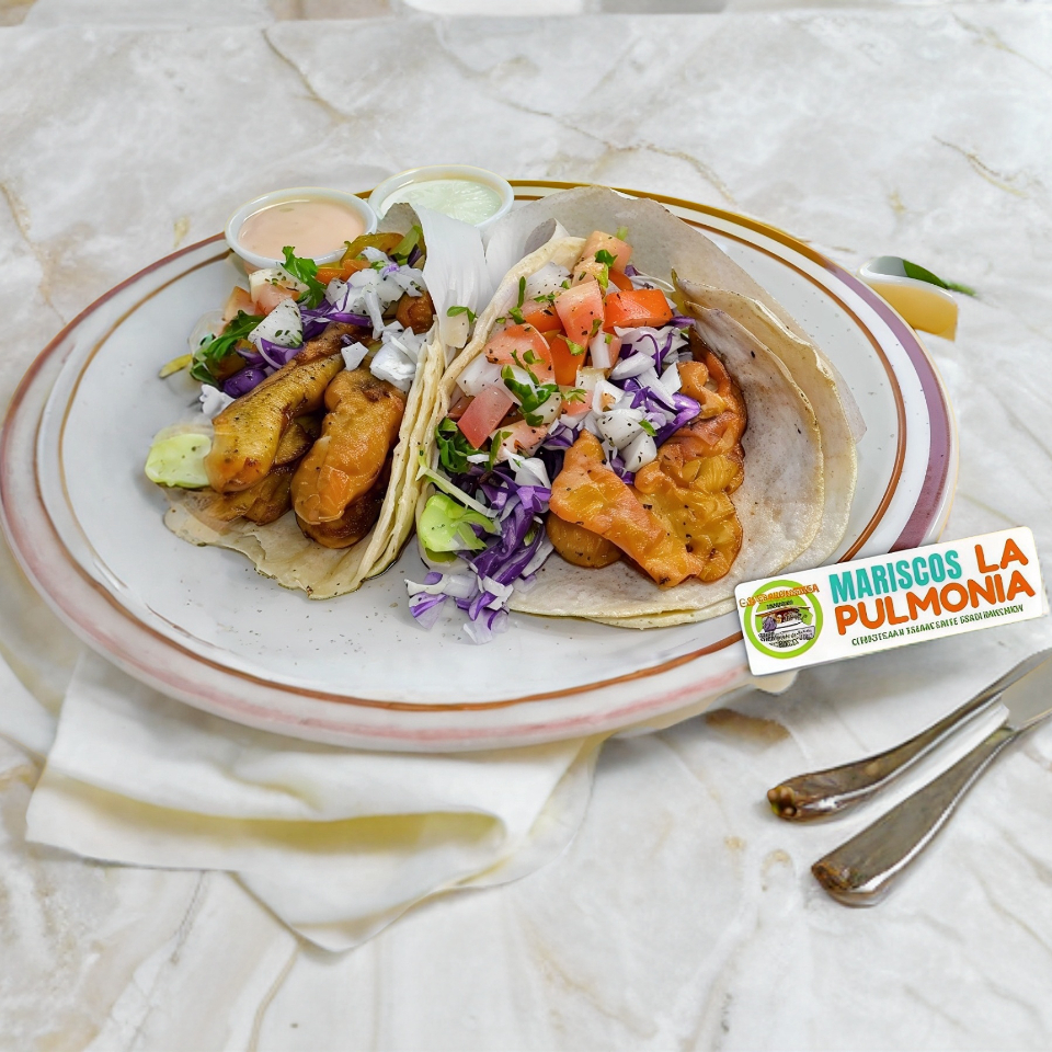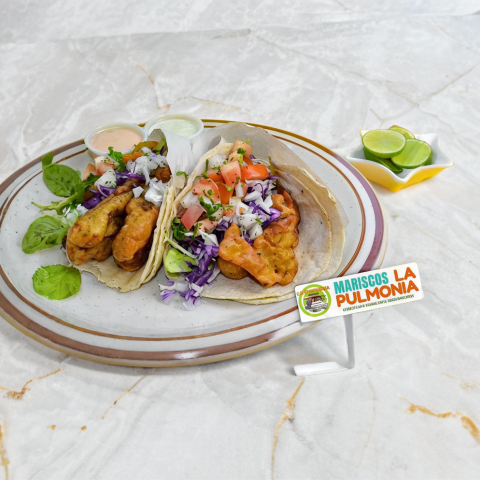 2 Tortillas de maíz con 2 tiras de pescado con repollo y salsa bandera.
