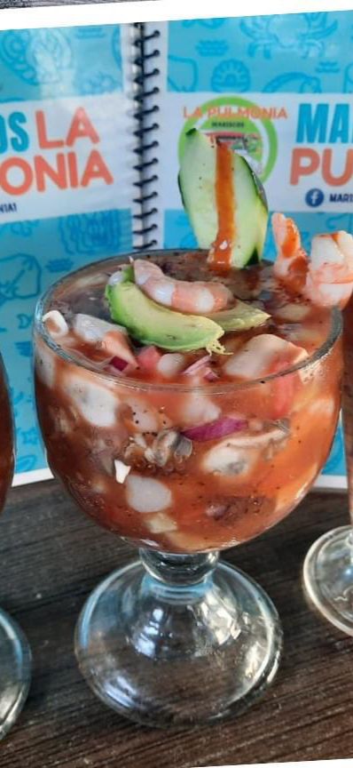 Camarón cocido, camarón curtido, callo de lobina, calamar, pulpo, ostión y pata de mula, con tomate, cebolla y pepino en cubos en caldo frío sazonado.