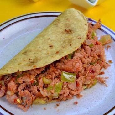 1 Tortilla de maíz con queso y marlín guisado con pimientos, tomate y cebolla.