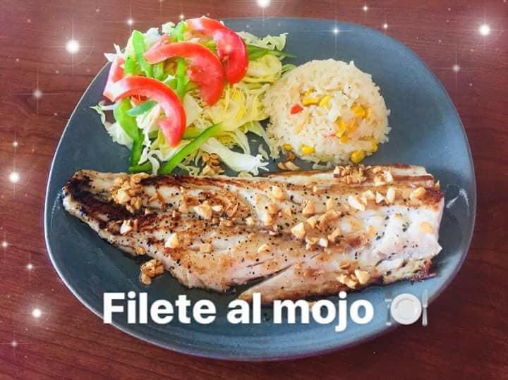 1 Filete de pescado a la plancha cubierto con guisado de ajo, acompañado de arroz y ensalada.