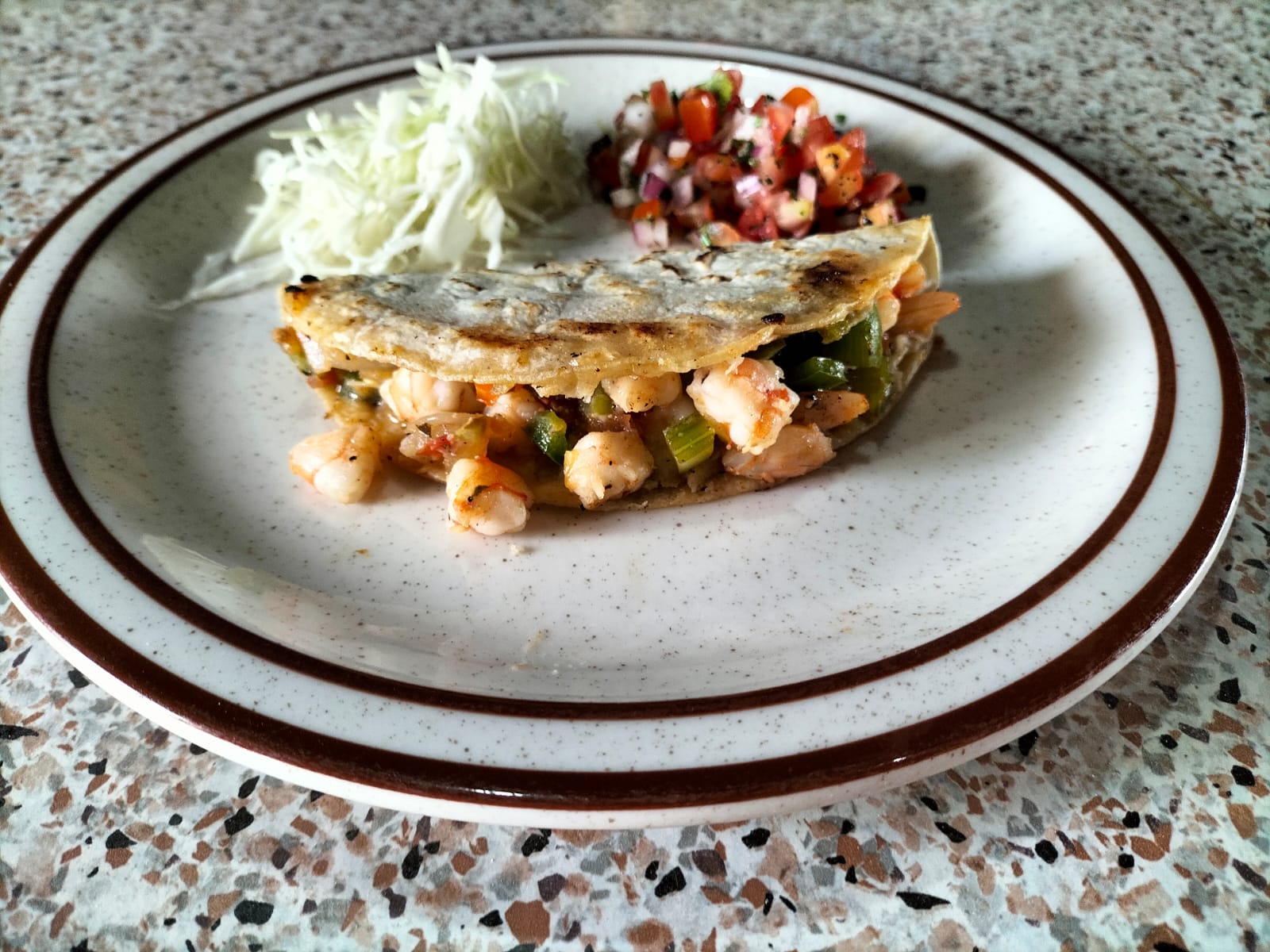 1 Tortilla de maíz con queso y camarón guisado con pimientos, tomate y cebolla.