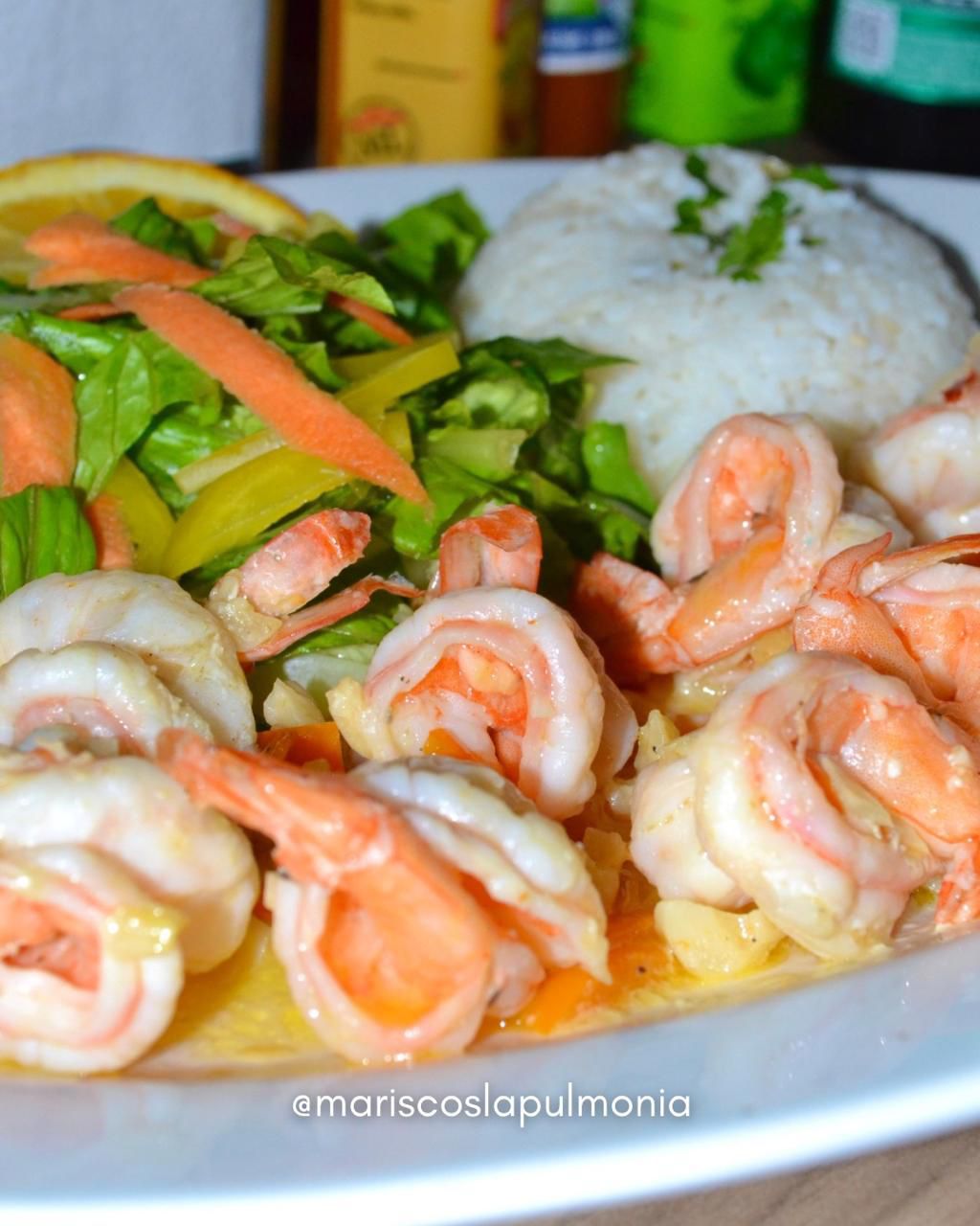 Camarón guisado con ajo, acompañado de arroz y ensalada.