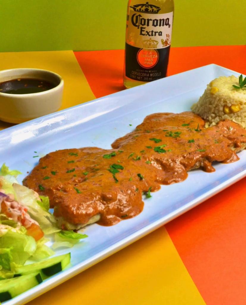 1 Filete de pescado bañado en crema de chipotle, acompañado de arroz y ensalada.