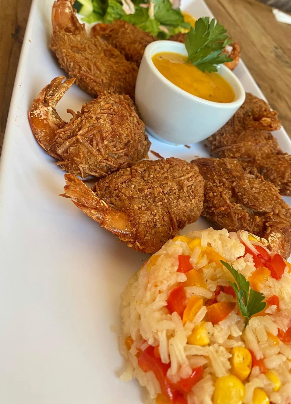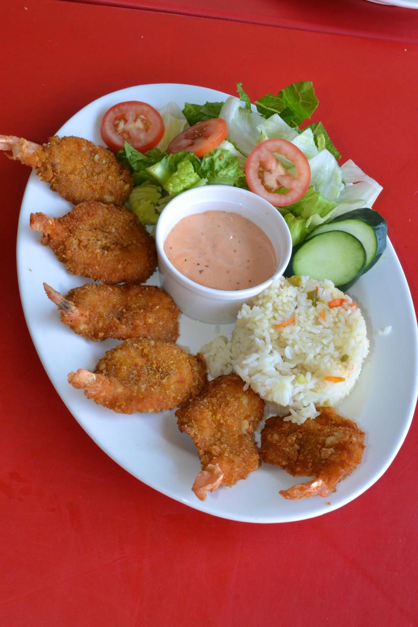 Camarones empanizados, acompañados de arroz y ensalada.