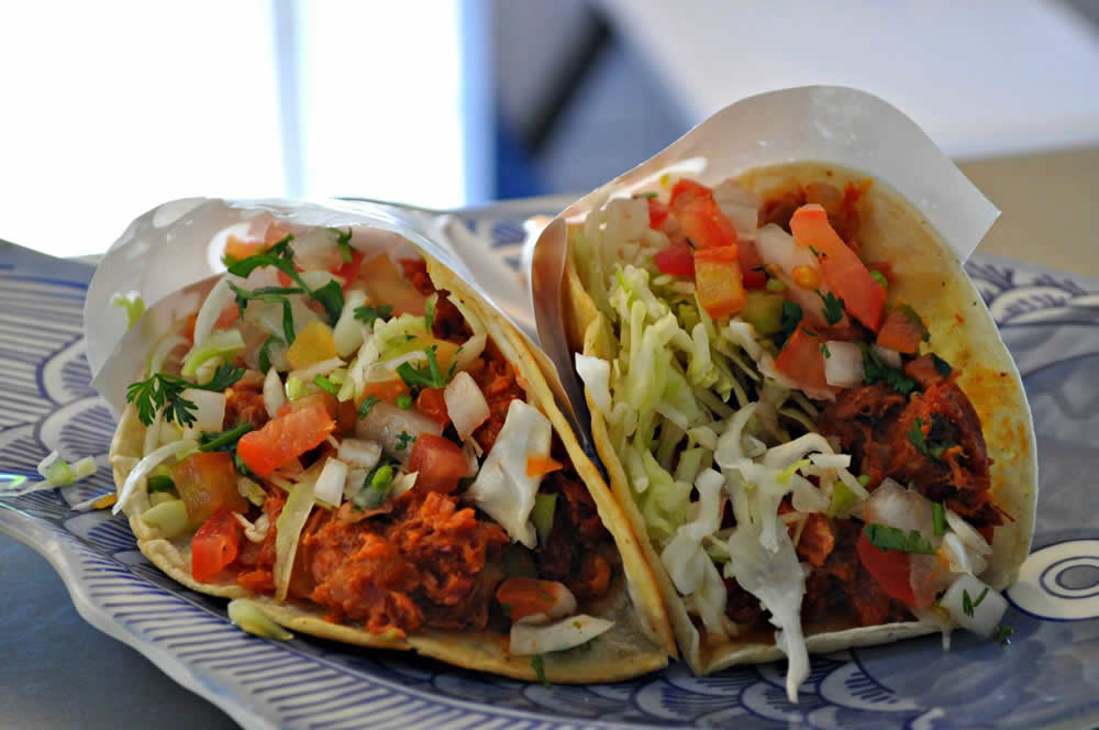 Marlín ahumado con pico de gallo, repollo, crema, salsa y aguacate.