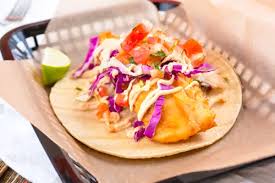 Camarón capeado con pico de gallo, repollo, crema, salsa y aguacate.