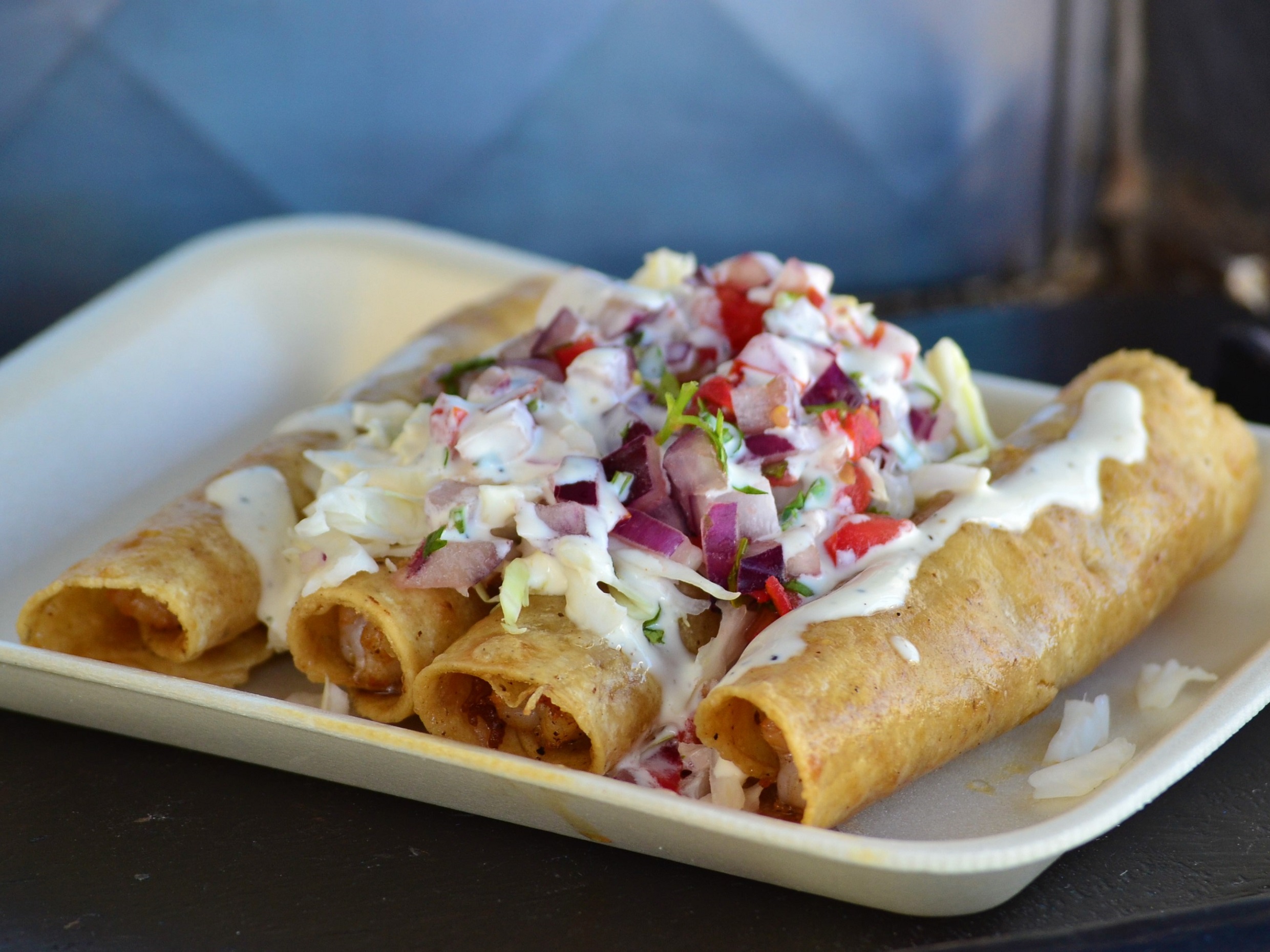 4 Flautas de Camarón con Repollo y Salsa Bandera. Llevan Crema y Salsa Picante Aparte.