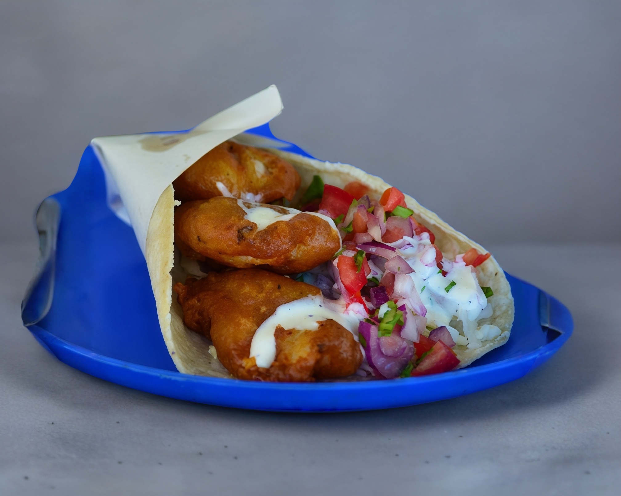 4 Flautas de Pescado con Repollo y Salsa Bandera. Llevan Crema y Salsa Picante Aparte.