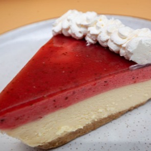 Cremoso postre con base de galleta, cubierta de fresa natural y una bola de nieve