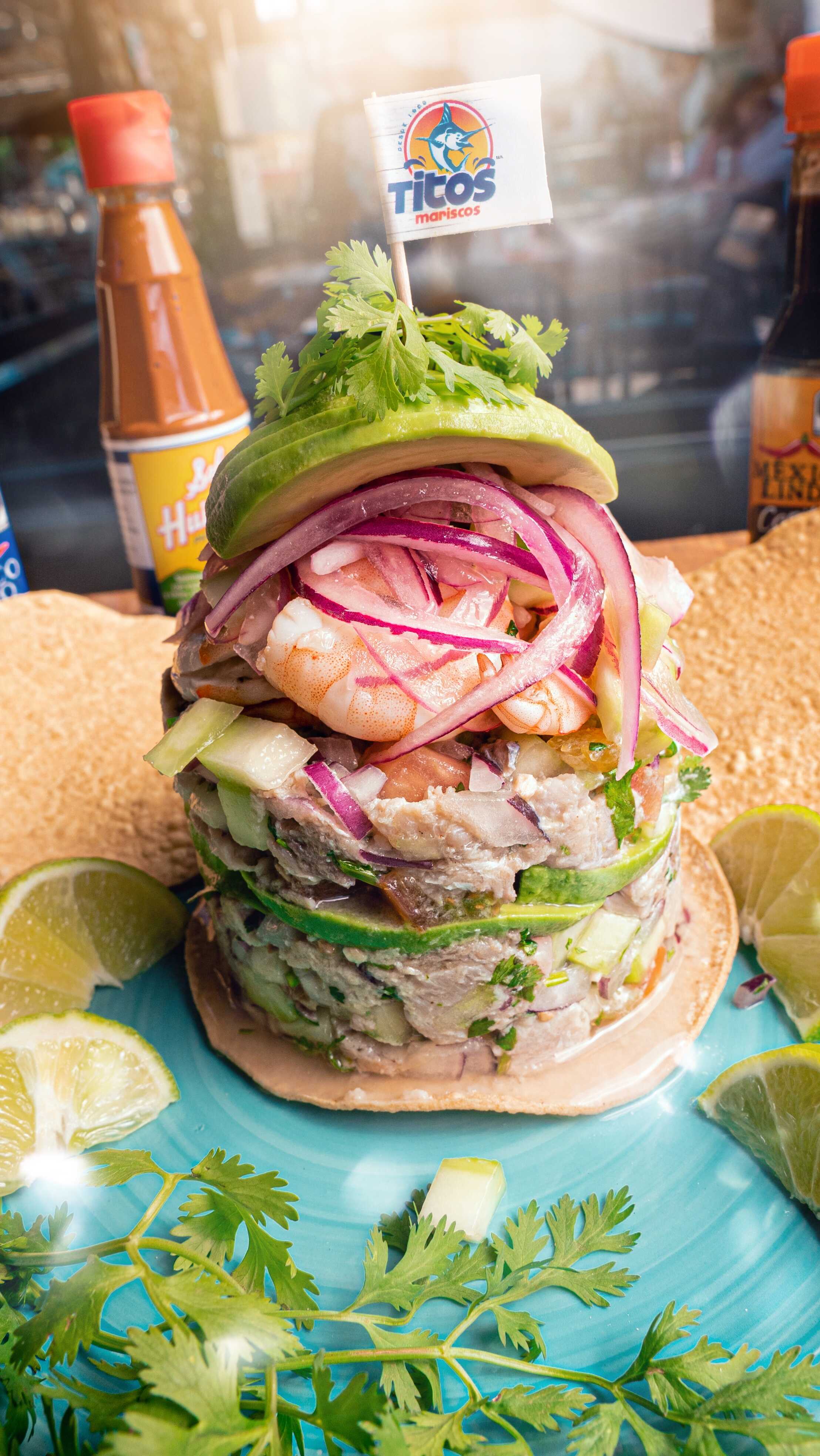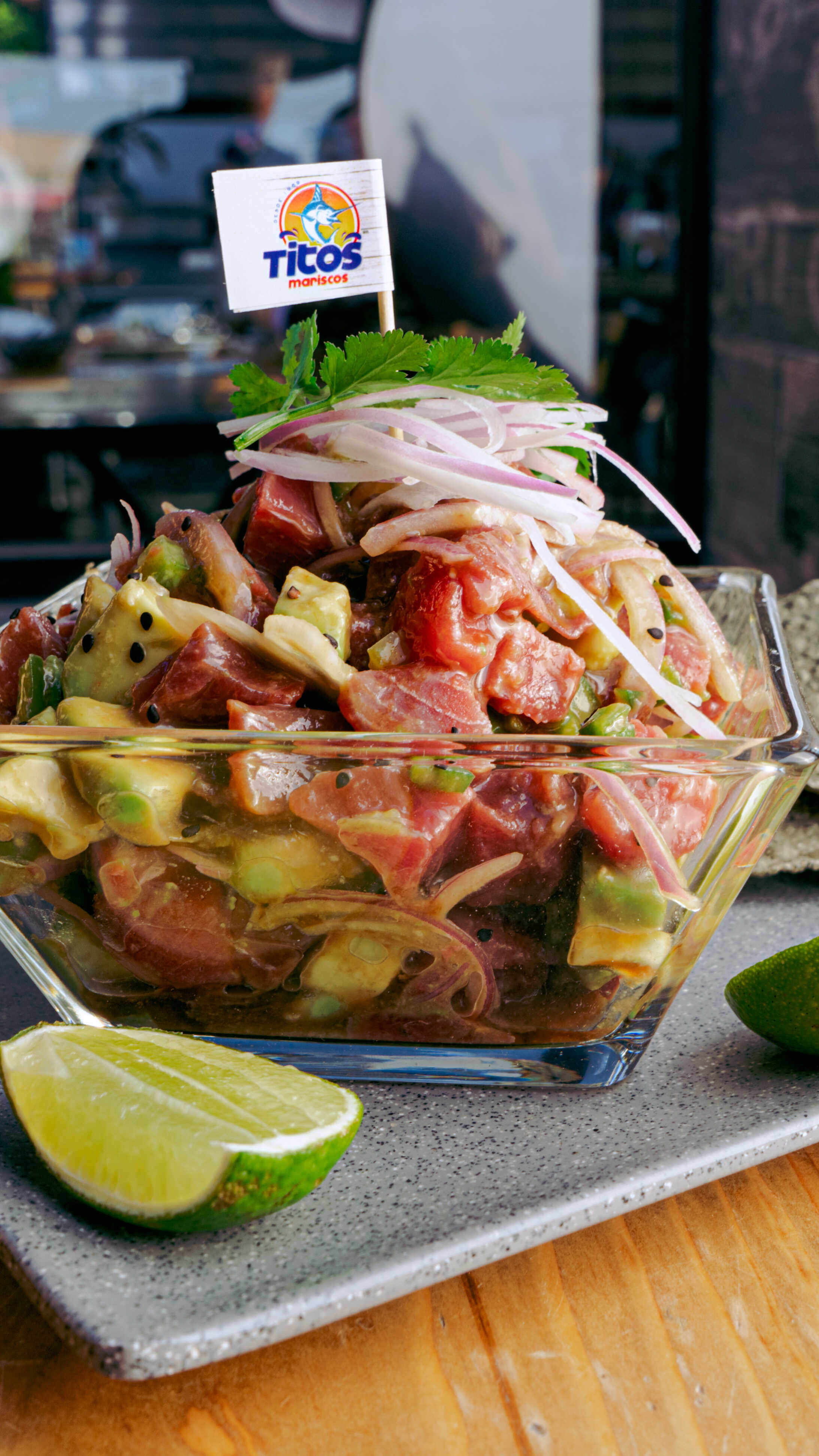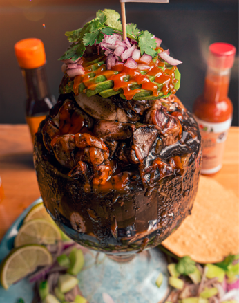 marlin, carne new york ,laminias de aguacate,champinones,cebolla morada guisada con chipotle camarones y aderezo chipotle