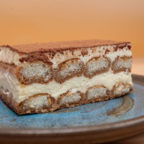 Postre cremoso con sabor a café y cacao, preparado con suave mezcla de queso y crema, acompañado con una bola de nieve