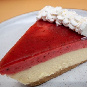 Cremoso postre con base de galleta, cubierta de fresa natural y una bola de nieve