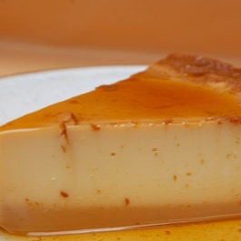 Delicioso flan napolitano, cremoso y suave, con un toque de vainilla y caramelo dorado, acompañado con una bola de nieve