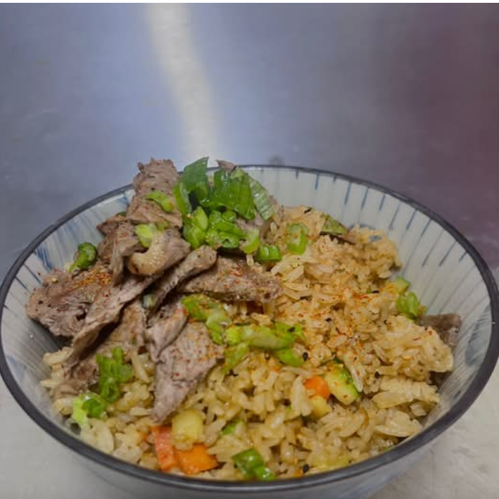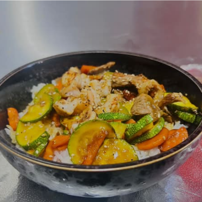 Zanahoria, calabaza, arroz frito, salsa de soya, togarashi y proteína de su elección. Contiene mariscos 🦐