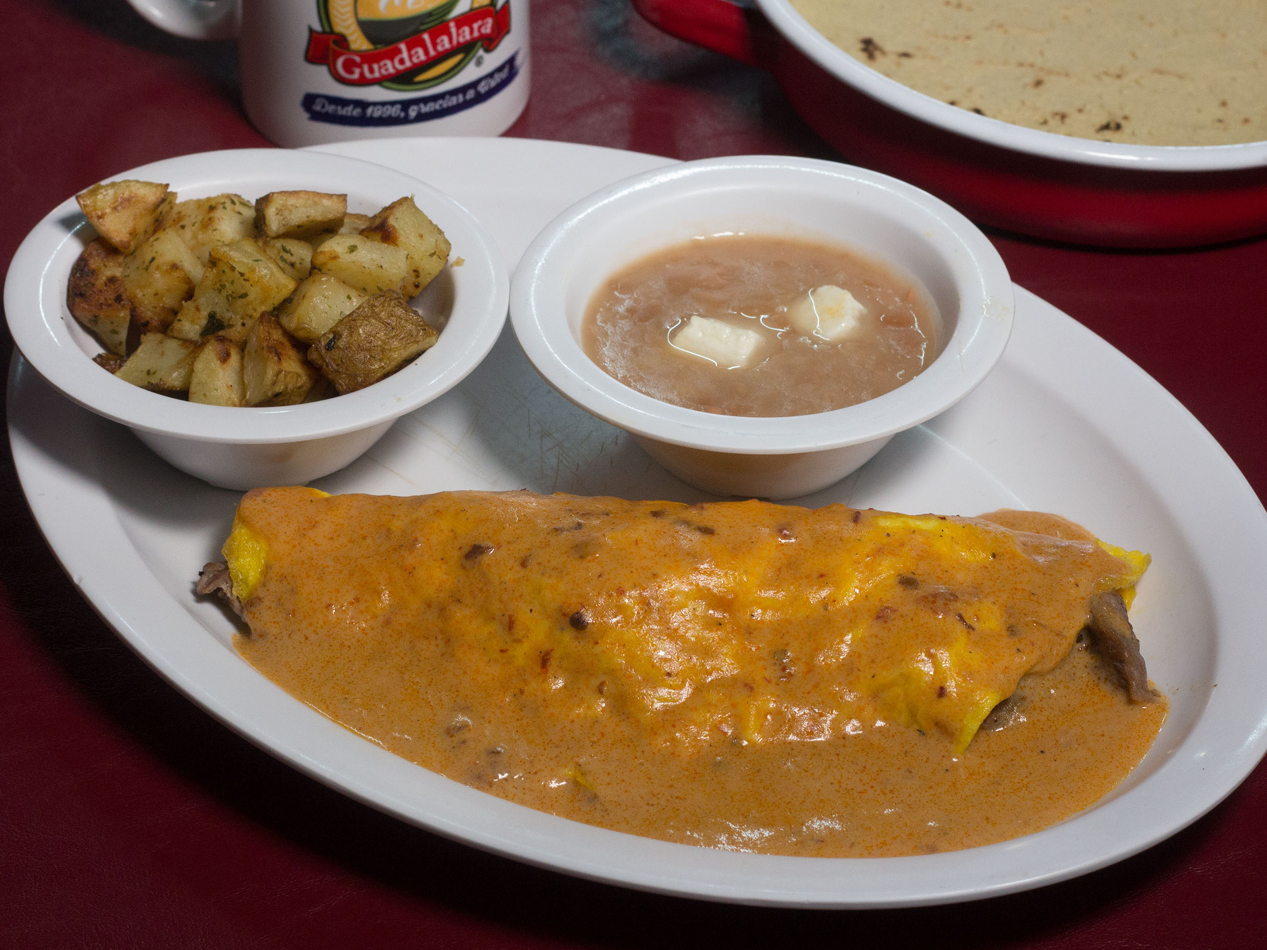 A elegir salsa, rojos, verdes o chipotle mas una porcion de papa y frijol.