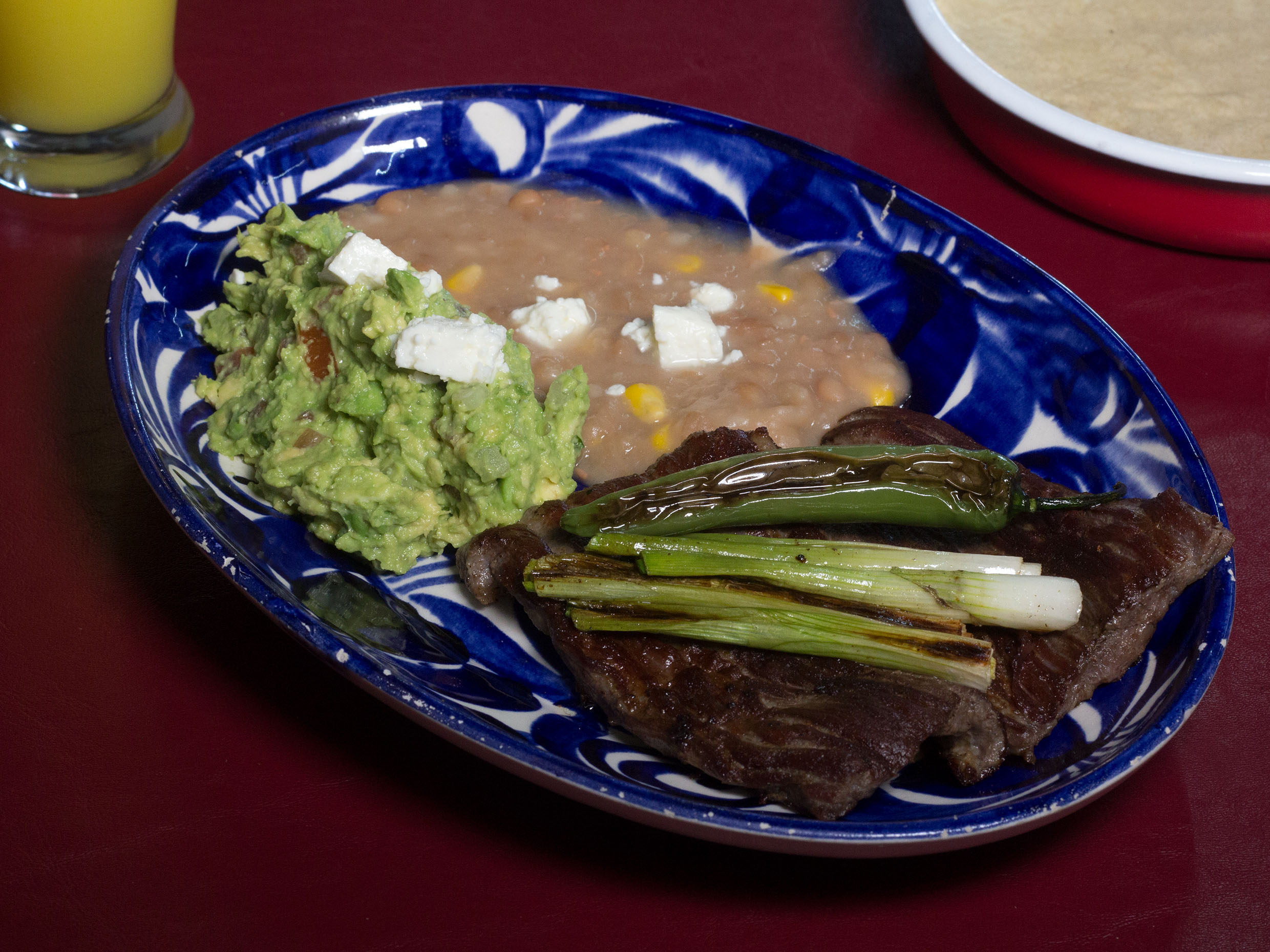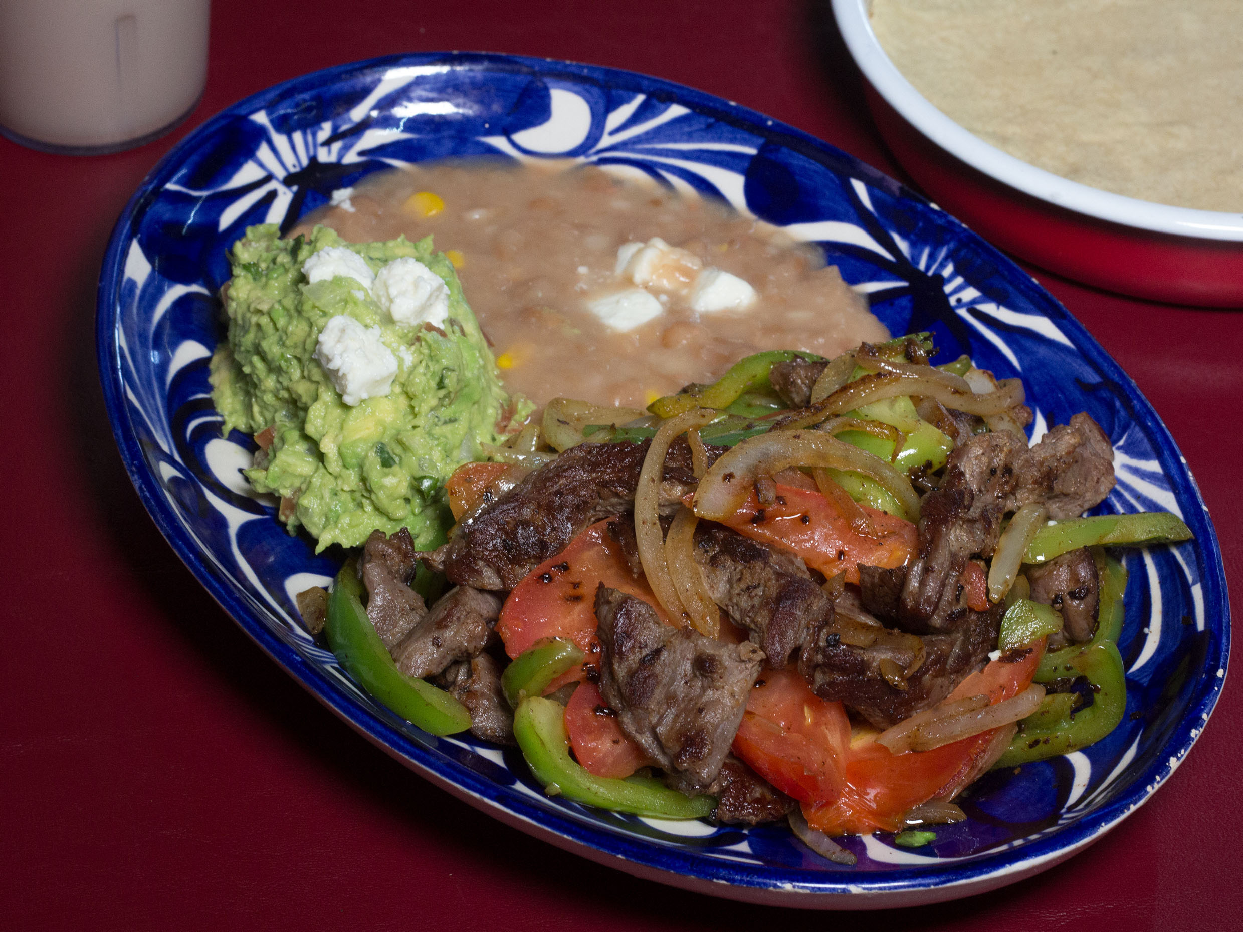 Arrachera en fajitas, con pimiento morron, cebolla tomate, guacamole y frijoles.