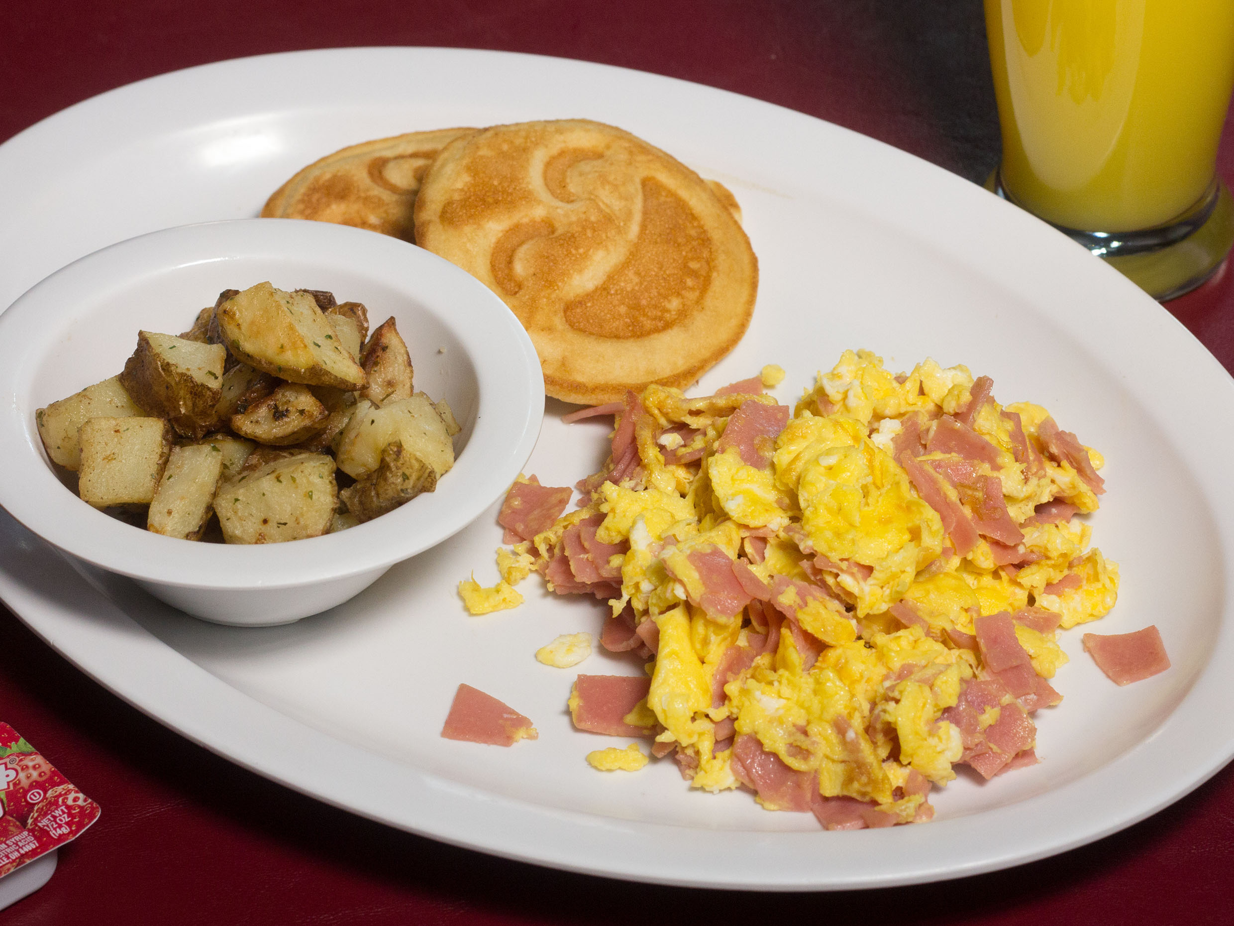 2 Huevos con jamon y papa de la casa + 2 mini hot cakes carita feliz