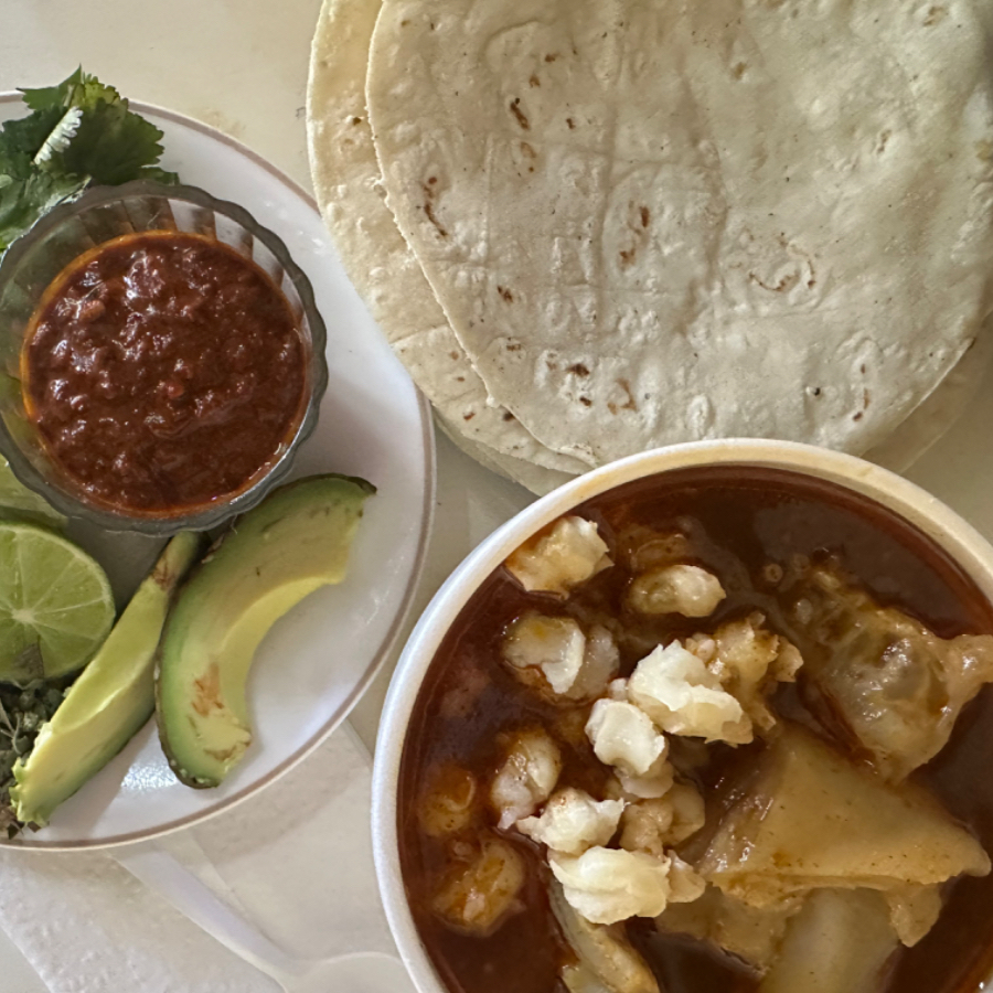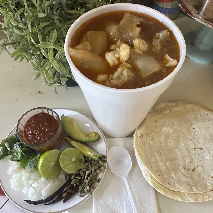 Tradicional caldo de panza de res servido en porción individual, acompañado de tortillas y complementos.