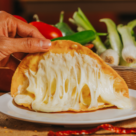 Tortilla de maíz doblada con queso fundido en su interior, preparada a la plancha.