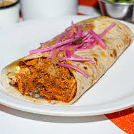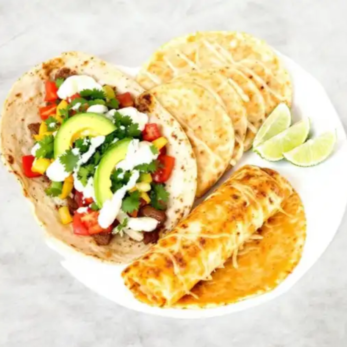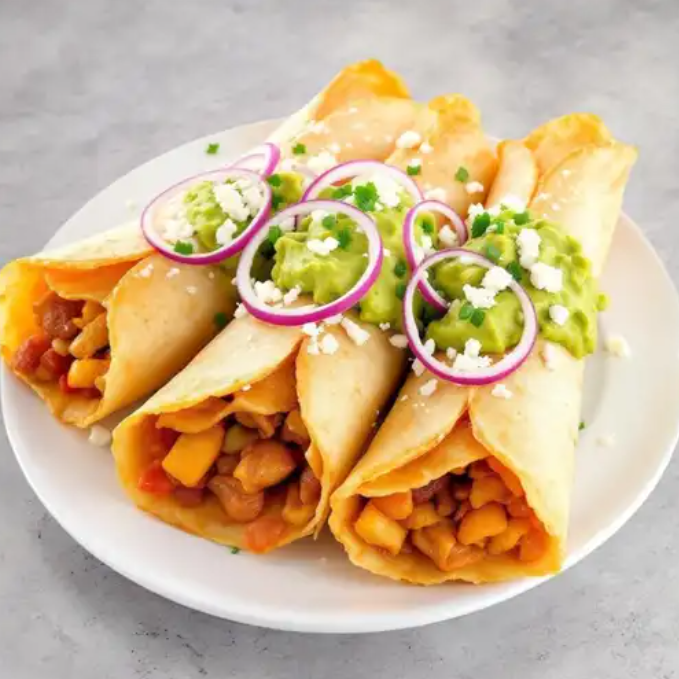 Flautas de proteína a elegir con guacamole, cebolla morada y queso.