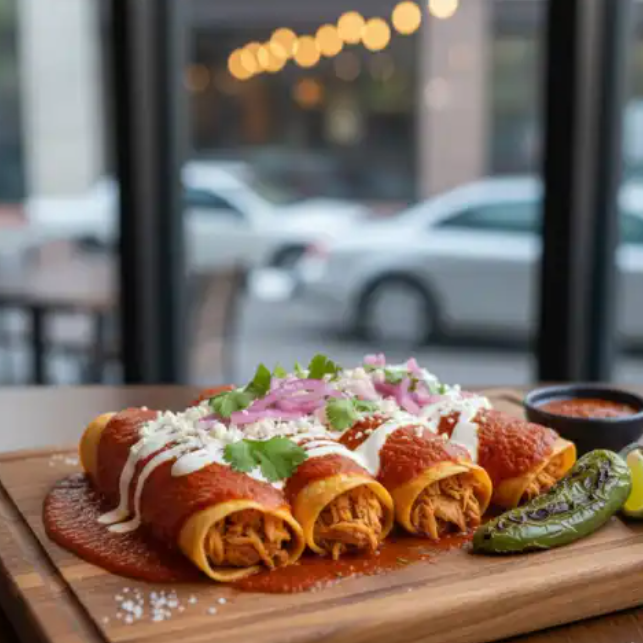 Enchiladas de pollo envueltas en salsa roja, servidas con crema y queso fresco