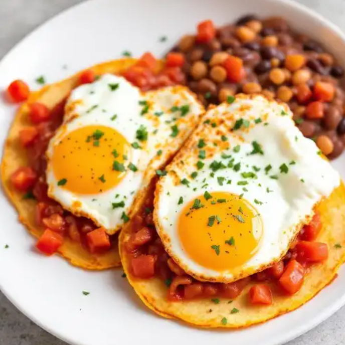 Huevos fritos sobre tortillas de maíz, bañados en salsa roja, acompañados de frijoles y crema, un clásico del desayuno mexicano