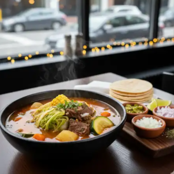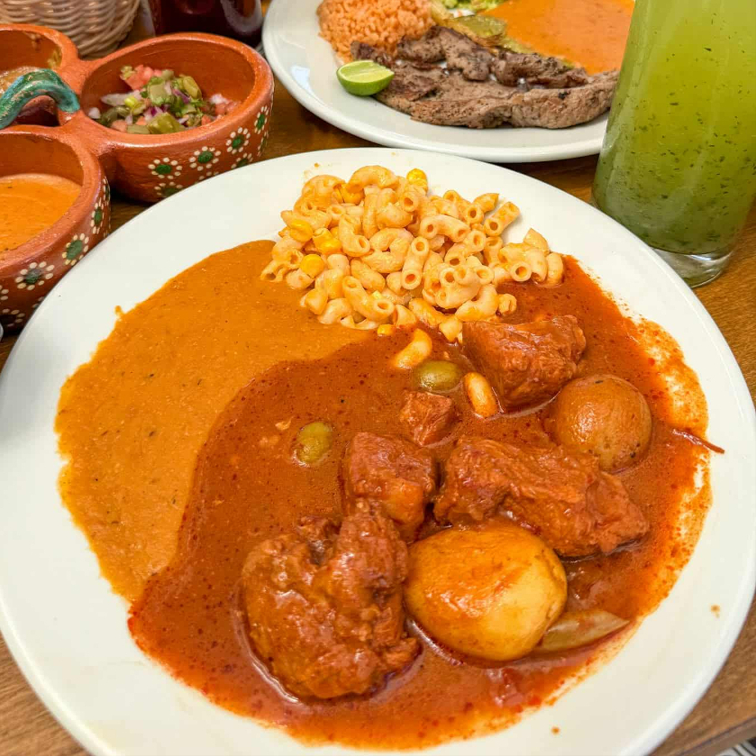 Barbacoa estilo Sinaloa, servida con frijoles puercos y una refrescante sopa fría.