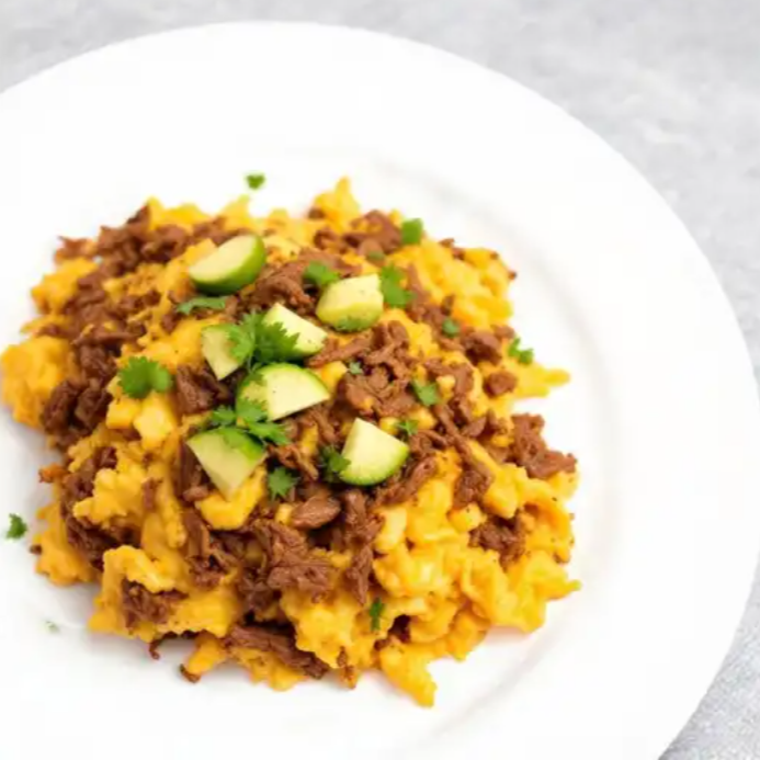 Huevos revueltos mezclados con machaca, carne seca deshebrada, ofreciendo un sabor auténtico y lleno de energía para comenzar el día