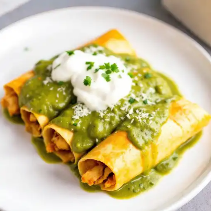 Deliciosas enchiladas rellenas de pollo, bañadas en una salsa verde vibrante y acompañadas de crema