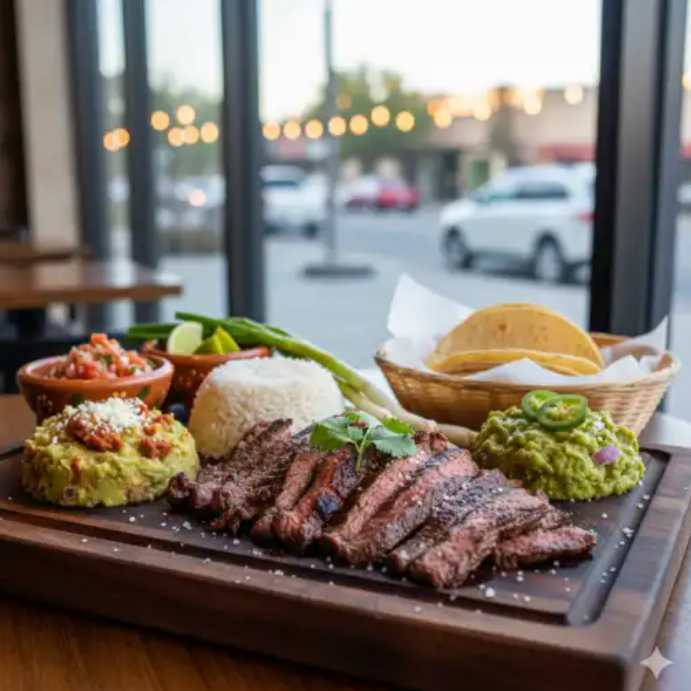Carne de res marinada, frijoles puercos, arroz, guacamole y complementos