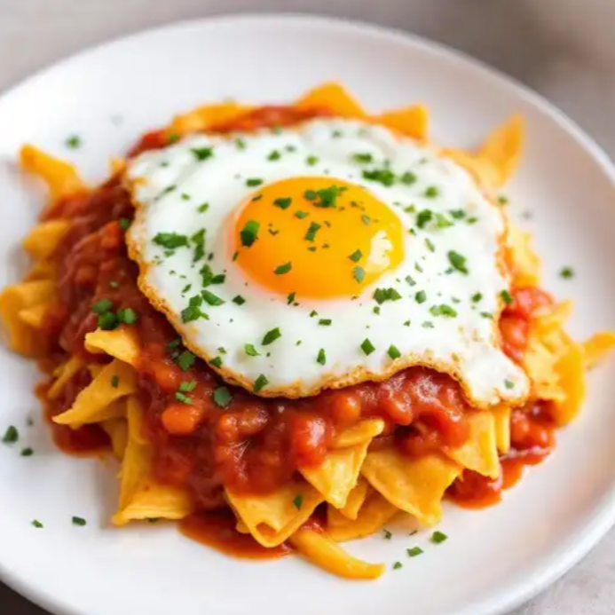 Totopos cubiertos con salsa roja o verde y un huevo estrellado, perfectos para un desayuno energético