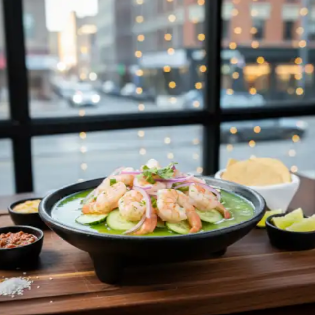 Aguachile Mi Cielo con camarones, rodajas de pepino y cebolla morada. Acompañado de tostadas y limón.