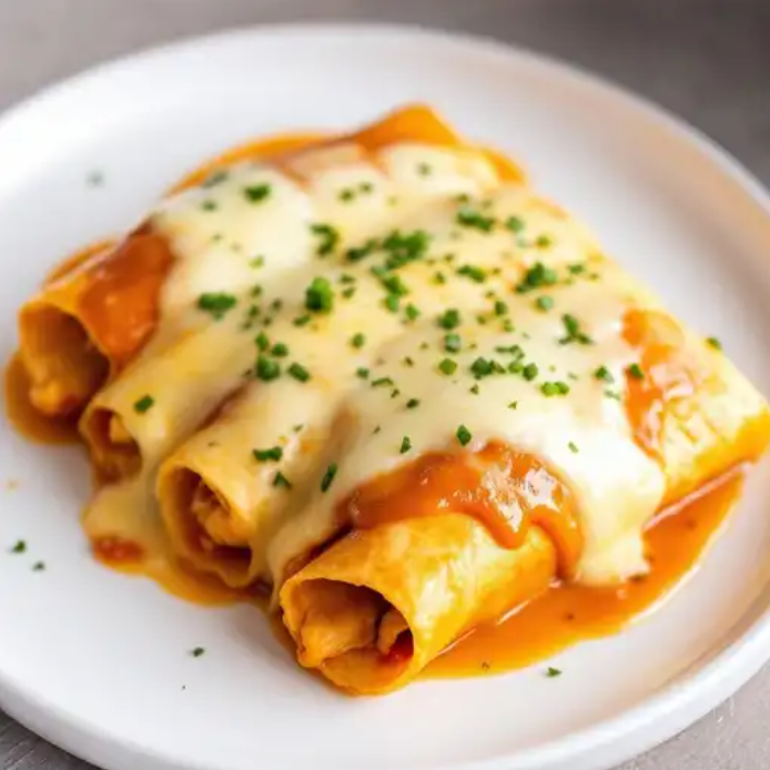 Enchiladas rellenas de pollo, cubiertas con salsa suiza y gratinadas con queso fundido.
