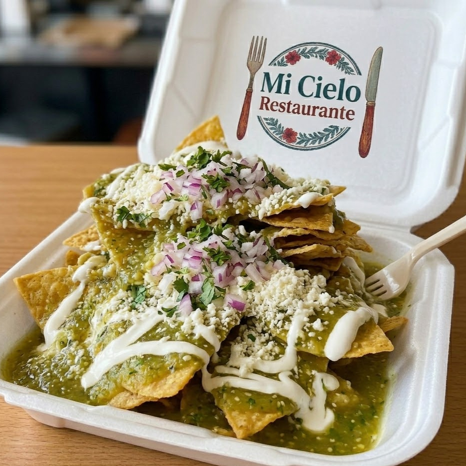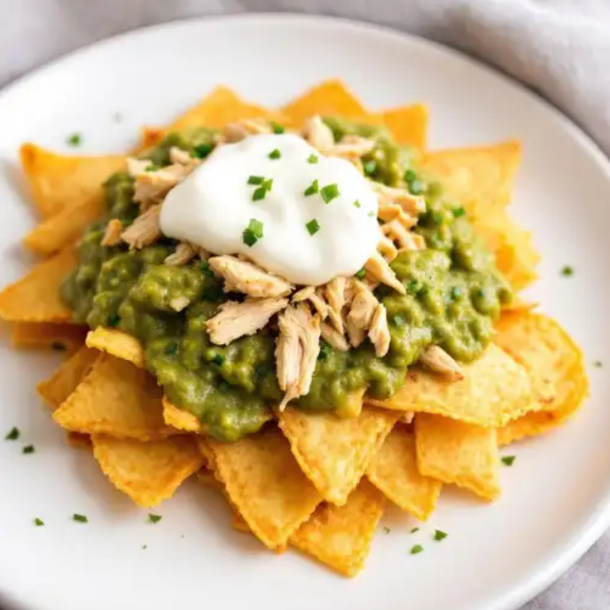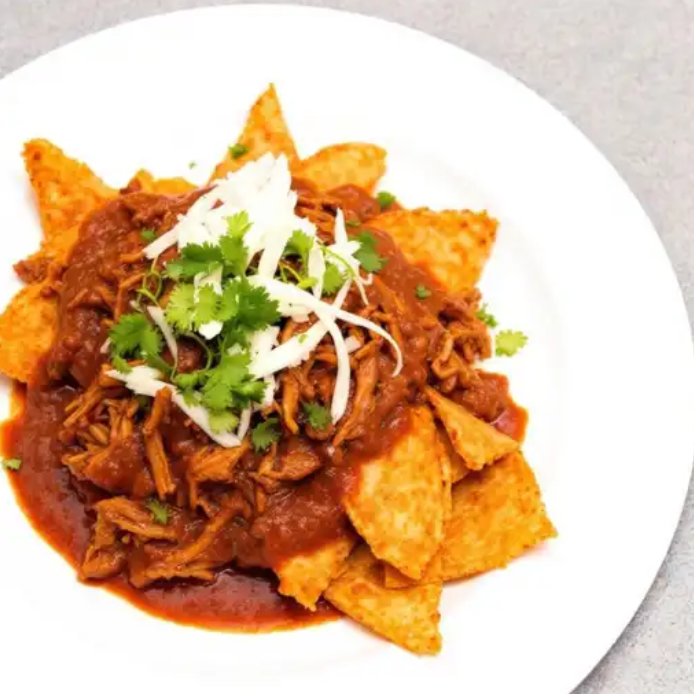 Crujientes totopos bañados en salsa roja o verde, acompañados de pollo desmenuzado y crema