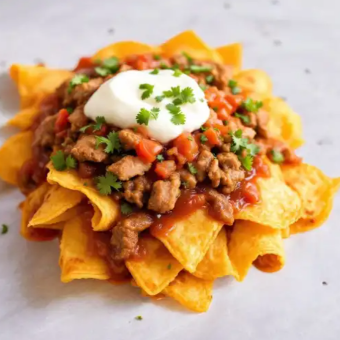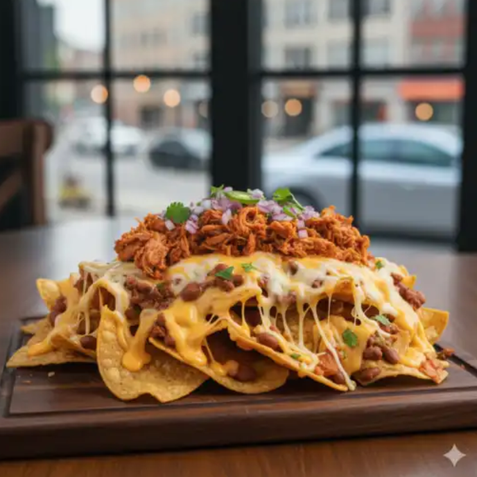 Nachos bañados en frijoles puercos, queso de nachos y queso, acompañados con cochinita