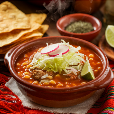 Pozole Rojo 1 Lt, Grano de maíz con carne de puerco, lechuga, rábano, cilantro, cebolla y tostadas.