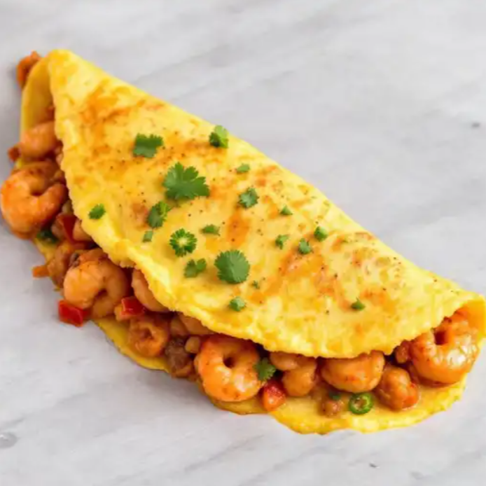 Omelette con tu relleno favorito, elige 1 preparación: con camarón enchilado, o elige Omelett mi cielo o elige omellet relleno con cochinita.