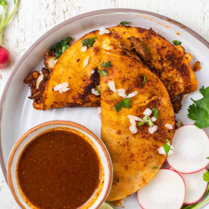 Taco de Birria, acompañada de cebolla, cilantro y limón.