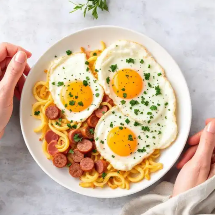 2 huevos preparados a su elección eligiendo opciones como jamón, salchicha o chorizo, ideales para personalizar tu desayuno