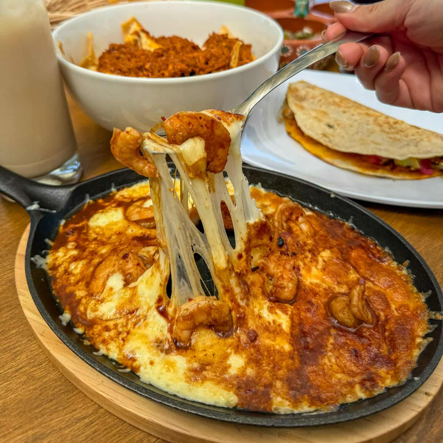 Queso fundido acompañado de camarones con una salsa especial de la casa, incluye tortillas