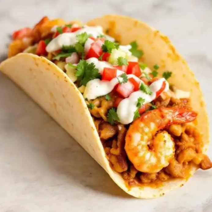 Taco relleno de camarón enchilado, servido con salsas frescas y guarniciones.