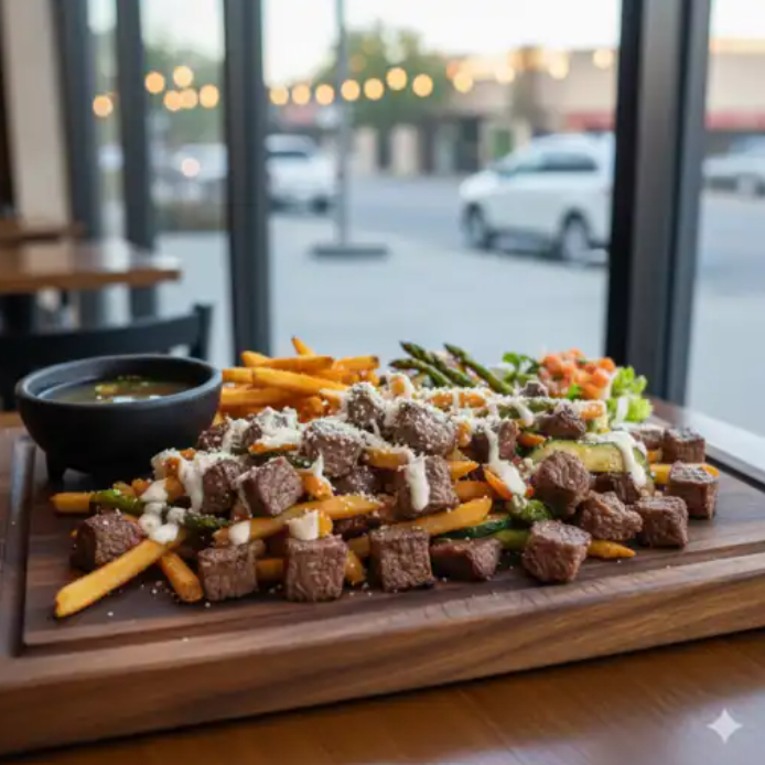 Chilaquiles crocantes servidos con arrachera jugosa, salsa y crema fresca.